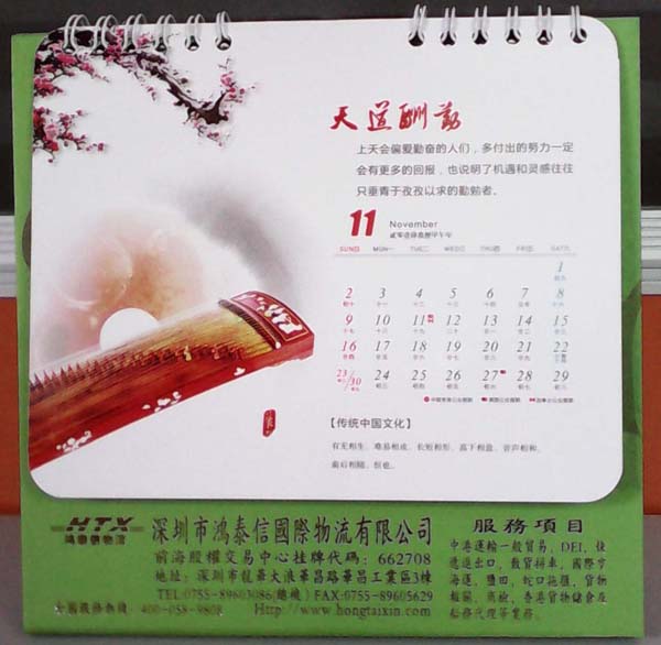 這批臺歷分是以紅色禮品袋套裝送出,每套里面有兩個臺歷(一大一小)和一個木制掛歷。鴻泰信重視人的精神世界和心境陶冶。小臺歷每頁左邊是漂亮的圖片,右邊配以陶冶心境的文字。如首頁的“厚德載物”“真正的智慧總是與謙虛相連,真正的哲人必然像大海一樣寬厚。”對謙虛和寬容的美好品德的贊揚,對道德的重視躍然于紙,卻深烙鴻泰信人心。又如第11月份的“天道酬勤”“上天會偏愛勤奮的人們,多付出的努力一定會有更多回報,也說明了機遇和靈感往往只垂青于孜孜以求的勤勉者。”鼓勵人們勤奮,也時時鼓勵著鴻泰信人不斷努力,為客戶提供最優(yōu)質(zhì)的中港貨運服務(wù)。