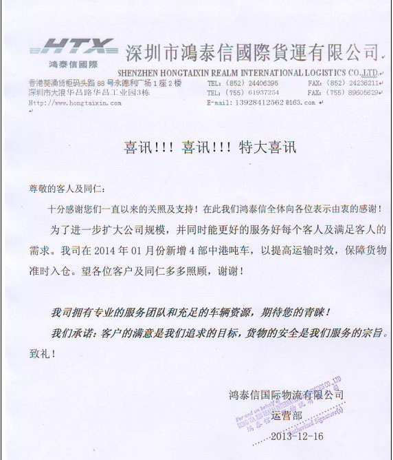 在此鴻泰信全體員工衷心感謝新老客戶的信任與支持!為了給新老客戶提供最優(yōu)質(zhì)的服務,滿足每個客戶對港車的需求和對時效的高要求!同時也為支持鴻泰信的不斷擴大,我司在2014年1月新增4部中港噸車,以提高運輸時效,保障貨物準時入倉。望新老客戶多多支持!