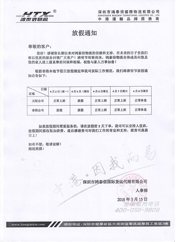 鴻泰信呈放假函,??蛻襞笥寻部?。