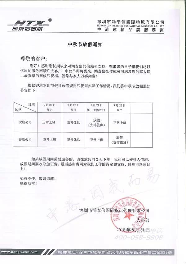 姑蘇鴻泰信物流2018中秋放假通知