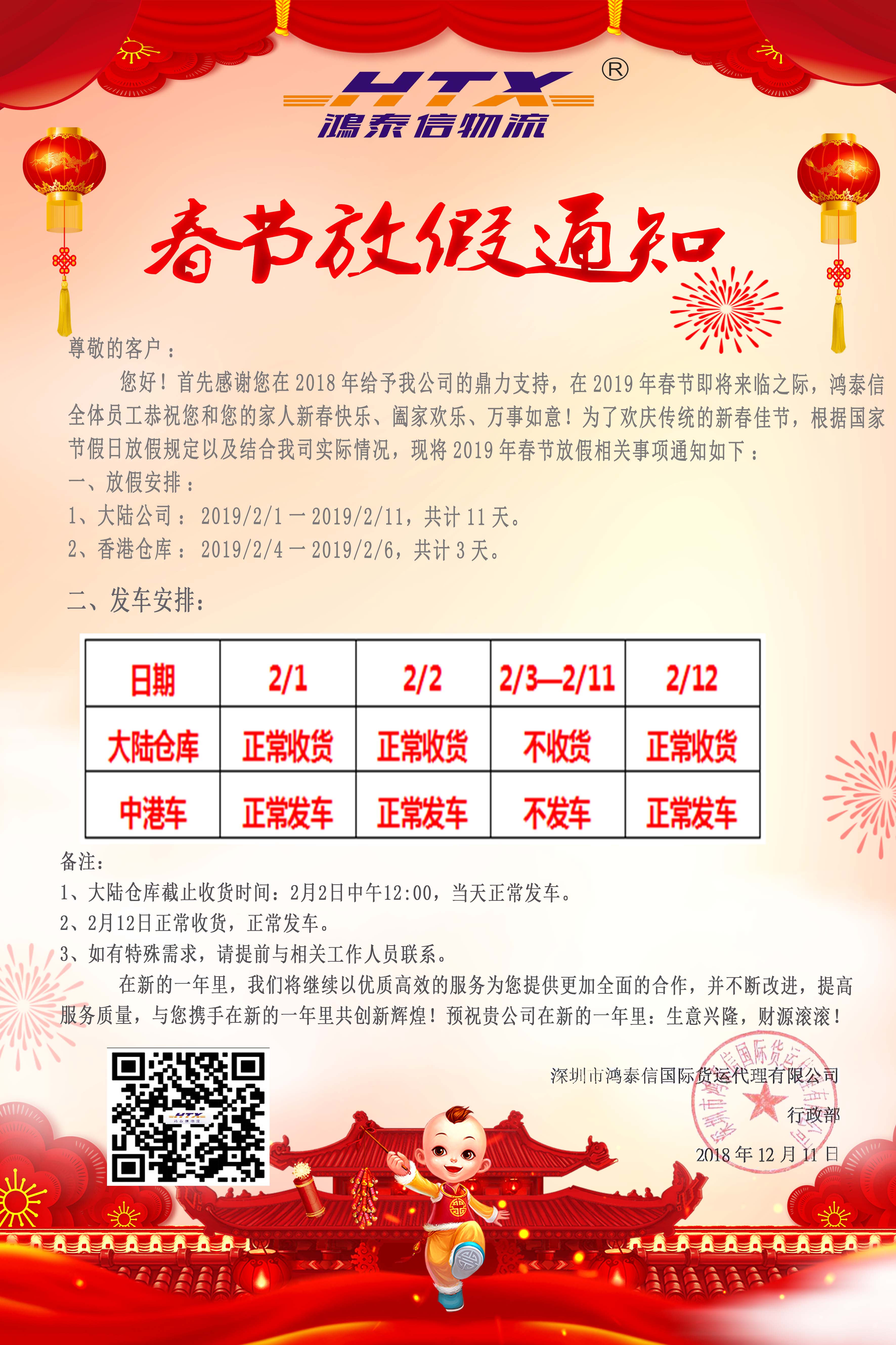 姑蘇2019春節(jié)鴻泰信物流放假通知