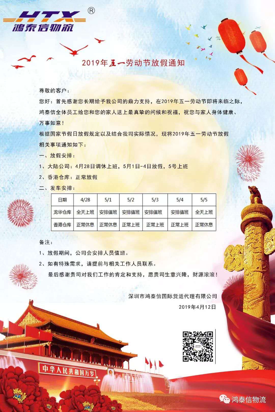 姑蘇2019鴻泰信五一放假通知