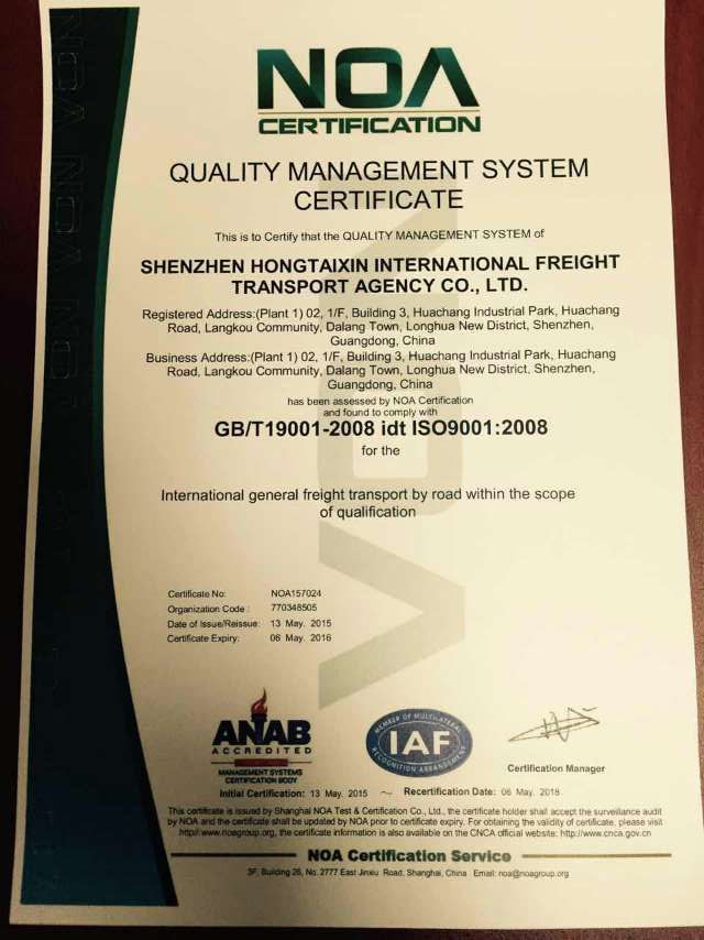 熱烈祝賀鴻泰信物流成功通過(guò)質(zhì)量管理體系認(rèn)證證書(shū)