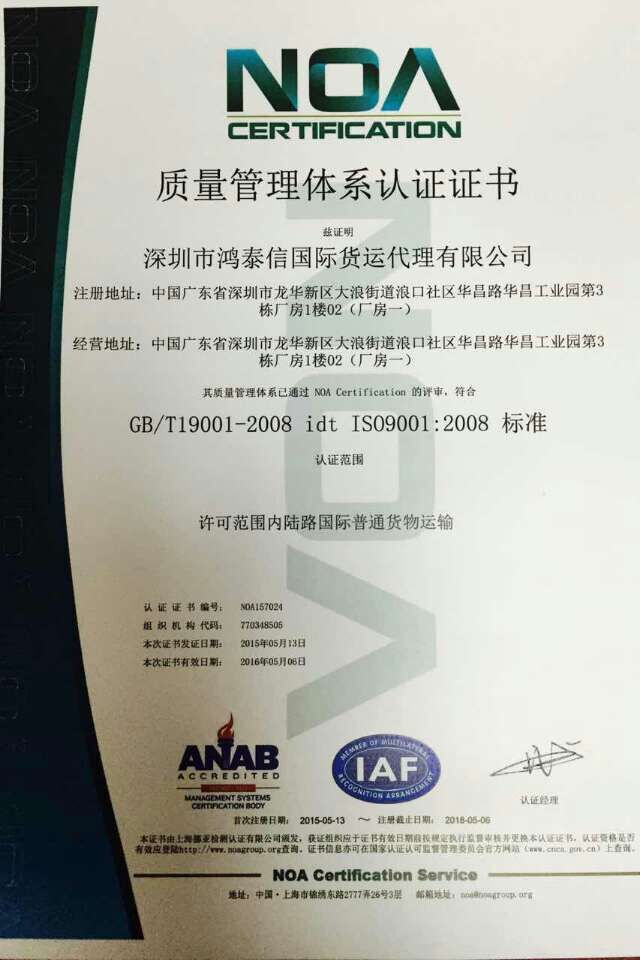 熱烈祝賀鴻泰信中港物流成功通過(guò)質(zhì)量管理體系認(rèn)證證書(shū) GB/T19001-2008 idt ISO9001:2008 認(rèn)證
