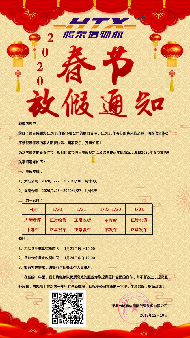 春節(jié)即將來臨,萬象更新,相信很多在外拼搏的追夢人都?xì)w心似劍了吧!在這里鴻泰信中港物流、中港貨運(yùn)、中港運(yùn)輸祝大家:一路平安,一帆風(fēng)順,財(cái)源廣進(jìn),喜事連連。附鴻泰信物流2020春節(jié)放假通知及工作安排。