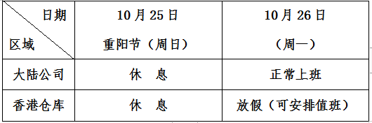 放假安排:香港倉(cāng)庫(kù)10月26日放假一天