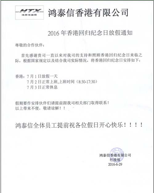 非常感謝貴司一直以來對鴻泰信中港物流公司的支持和照顧,香港回歸幾年日的來臨之際,根據(jù)國際規(guī)定以及結(jié)合我司實(shí)際情況,將香港回歸紀(jì)念日安排如下: