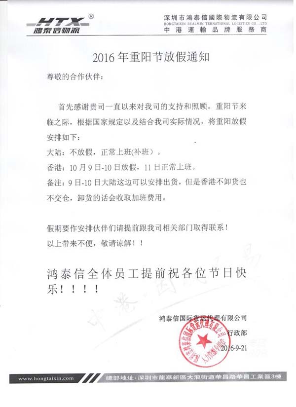 首先感謝貴司一直以來對我司的支持和照顧。重陽節(jié)來臨之際,根據(jù)國家規(guī)定以及結(jié)合我司實際情況,將重陽放假安排如下: