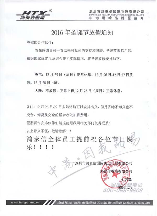 西方的圣誕節(jié)和中國過年一樣,是一個盛大喜慶的節(jié)日。當圣誕樹、麋鹿、圣誕老人等,象征節(jié)日的事物出現(xiàn)在各大商場、超市,我們會突然來一句:“哦,馬上要過圣誕節(jié)了”。現(xiàn)在,不僅是西方,在中國也有很多人過圣誕節(jié),節(jié)日總和放假聯(lián)系在一起,以下是鴻泰信物流——中港運輸品牌服務(wù)商的放假安排,敬請一閱: