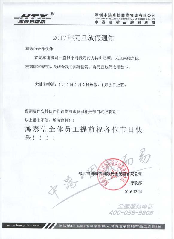 光陰如白駒過隙,轉(zhuǎn)眼2016最后一個(gè)月已過半,2017的腳步越來越近,鴻泰信中港物流公司在此向全體員工和廣大客戶朋友致以節(jié)日的問候,為了度過歡樂、祥和、平安的節(jié)日,我司安排元旦假期如下: